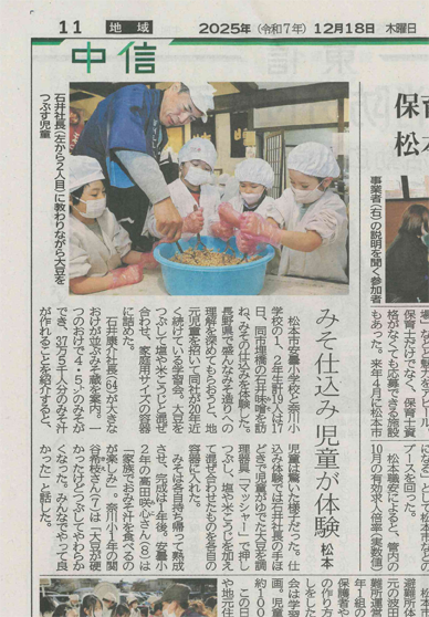 2025年12月18日 信濃毎日新聞(中信版)で松本市の小学生「味噌の仕込み体験」が紹介されました。